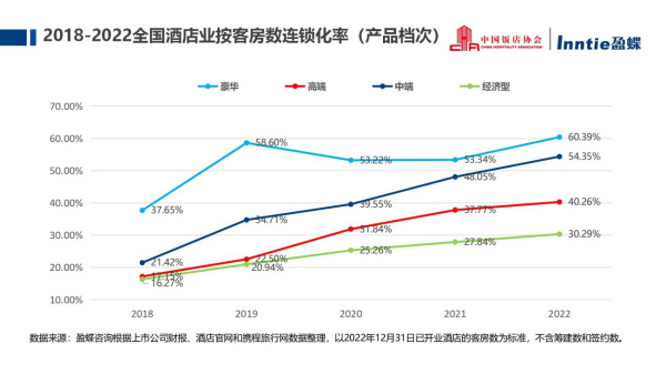 《2023中國酒店業發展報告》數據顯示,截止2022年12月31日,中國內地(大陸)住宿業設施總數為43萬家,客房總規模1529.1萬間。其中酒店業設施27.9萬家,客房總數1426.4萬間——其中連鎖客房數是553萬間,連鎖化率約為39%,酒店非連鎖化率約占61%,酒店品牌化的空間仍較大。