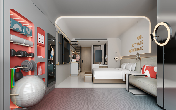 筆者觀察發現,作為創新品牌,繽躍酒店無疑是一種“生活體育”的酒店實踐。繽躍酒店打破常規,其產品設計以“沉浸式社交體驗場景”為核心的產品規劃,創造性地提出了“432法則”——即為消費者提供包括“360度健康活躍運動體驗、卡路里精算有機餐吧、充能復原主題客房、全周期管家式服務“在內的4個體驗;包括“酒店團操房、卡路里精算吧、私享健康倉”在內的3個中心以及包括“線下沉浸式健康服務、線上社群型智能聯動”在內的2個聯動,以此來打造全周期的健康運動生活方式——它正將大健康運動產業與酒店線下場景深度融合,打通線上線上、商旅與本地的客群。