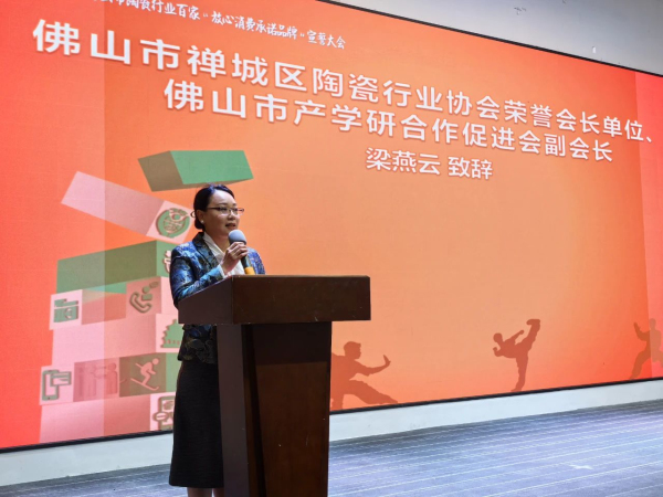 ▲佛山市禪城區陶瓷行業協會榮譽會長單位、佛山市產學研合作促進會副主任梁燕云致辭