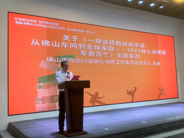 會上,佛山市陶瓷行業放心消費工作委員會負責人王建先生作了題為《一塊瓷磚的誠信承諾:從佛山車間到全球家庭》的主題發言。他詳細闡述了誠信承諾的重要性和具體實施路徑:“從原材料采購到生產加工,從質量檢測到包裝運輸,每一個環節都關乎著瓷磚的品質和消費者的權益。我們倡議百家企業共同簽署‘放心消費承諾’,就是要建立起一套完整的誠信體系,確保每一塊從佛山車間走出的瓷磚都能成為消費者心中的放心之選,讓佛山瓷磚的美譽度傳遍全球每一個家庭。”