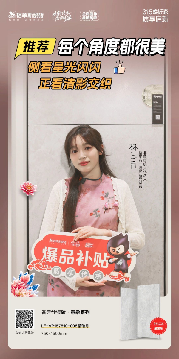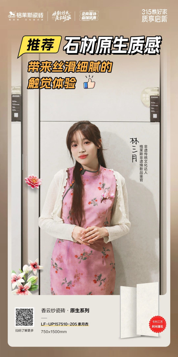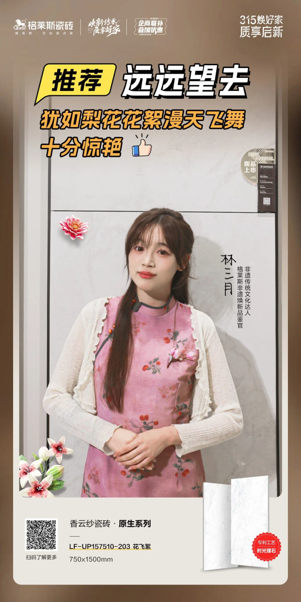 非遺文化作為頂級華流,在春晚的舞臺上華麗綻放,點燃了大眾對傳統文化的熱愛與自豪,就在今年315格萊斯發起“315煥好家 質享啟新”全國聯動促銷,攜手非遺傳統文化達人林三月、絨花非遺傳承人征珊珊,以絨花為謀,以價值詮釋傳承煥新,推出非遺紀錄片《詩意東方 瓷韻絨光》。