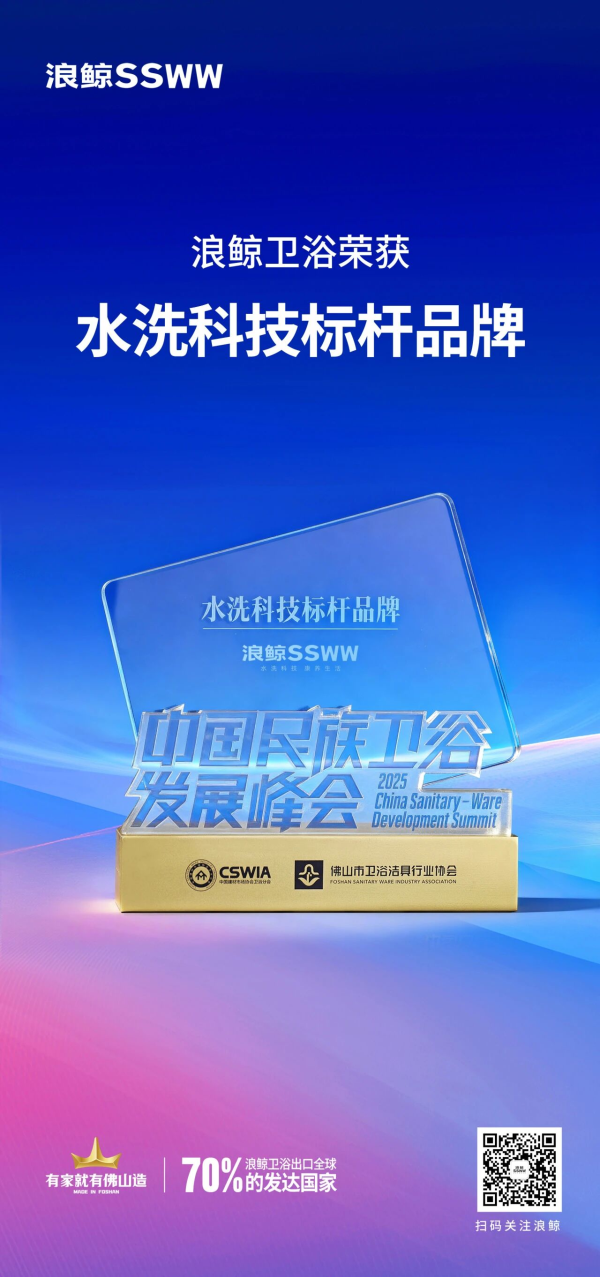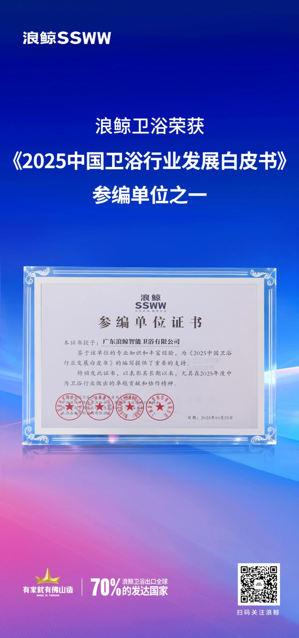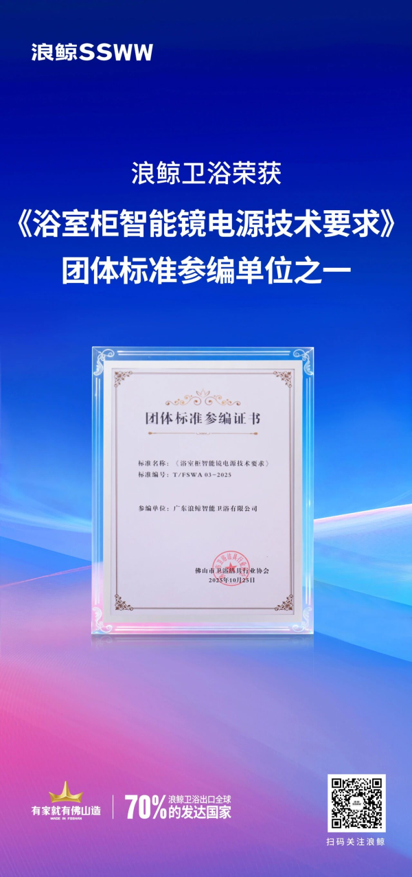 10月25日,2025中國民族衛浴發展峰會在廣東佛山盛大召開。會上,浪鯨衛浴憑借卓越的品牌實力榮獲“水洗科技標桿品牌”,并以行業專業知識和經驗成為《2025中國衛浴行業發展白皮書》及《浴室柜智能鏡電源技術要求》團體標準參編單位之一。
