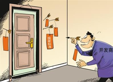 ■ 時事漫畫 據(jù)新華社報道,河南鄭州市沈莊村的安置房被爆出現(xiàn)嚴重質量問題。其中,門的外殼是一層薄薄的紙漿做的。開發(fā)商解釋說,室內門目前沒有國家標準,而且這種蜂窩門“是環(huán)保節(jié)能型材料,具有保暖、隔音等作用”。 漫畫/勾犇