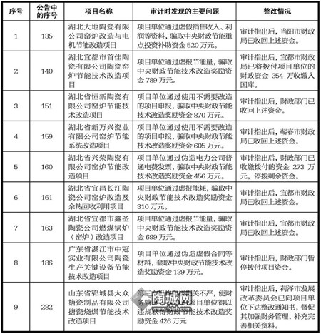 “三款科目資金”審計結果顯示,云南省曲靖市石林錦達瓷業有限公司、湖北省宜昌長江陶瓷公司、湖北宜都市首佳陶瓷有限公司、湖北大地陶瓷有限公司、湖北省興榮陶瓷有限公司、湖北省恒新陶瓷有限公司、湖北省鄂州中冠陶瓷有限公司、湖北陶星陶瓷科技有限公司、湖北省宜都市鑫圣陶瓷公司、湖北省新萬興瓷業有限公司、廣東省湛江市中冠實業有限公司、廣東潮州時尚衛浴實業有限公司以及山東省鄆城縣大眾搪瓷制品有限公司等14家國內陶瓷衛浴產業機構,利用窯爐、噴霧塔、電機設備以及余熱(尾氣)回收利用等節能改造項目,共騙取中央獎勵資金高達7392.83萬元,約占報告總體涉案金額的4.6%,現已收回違規資金3631萬元,回收率尚不足50%。