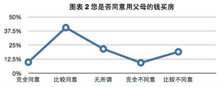 在有關“是否同意用父母的錢買房”上, 21%的被訪者持中立態度,覺得無所謂;其中41%比較同意使用父母的錢買房,10%的被訪者完全同意用父母的錢來買房。
