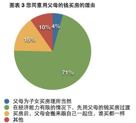 雖說一半以上被訪者同意用父母的錢買房,但從原因來看,主要出于自身經濟能力有限,先用父母的錢買房過渡,同時,不容忽略,15%的子女認為買房后,父母會搬過來一起住,因此誰買都一樣。