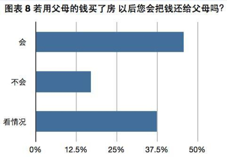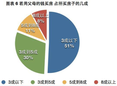 調查顯示,51%的被訪者在使用父母錢買房時,在房屋總價格的3成以下。而3到5成的占30%,5成到8成的占11%,8成以上的僅8%。