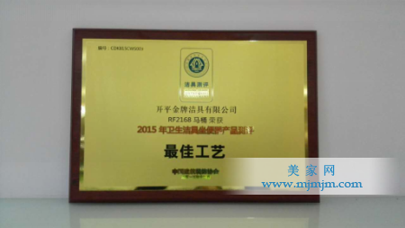 金牌衛(wèi)浴RF2168所榮獲的 2015年度衛(wèi)生潔具坐便器產(chǎn)品測評“最佳工藝”金馬桶獎牌匾