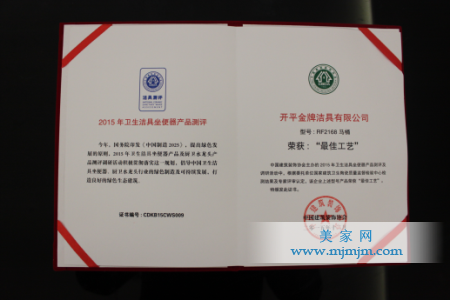 金牌衛(wèi)浴RF2168所榮獲的 2015年度衛(wèi)生潔具坐便器產(chǎn)品測評“最佳工藝”金馬桶獎最佳工藝榮譽證書