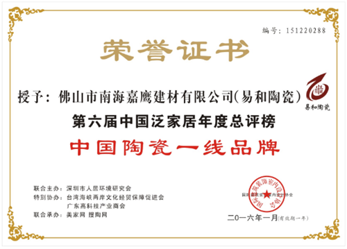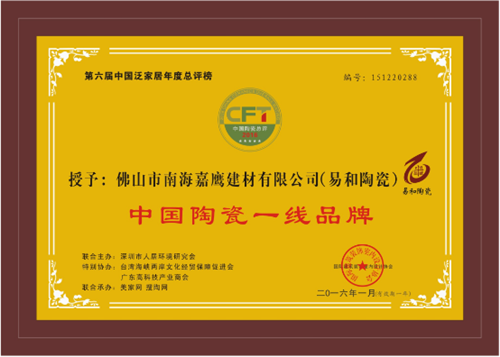 2016年1月7日下午,由國際建筑裝飾室內(nèi)設(shè)計協(xié)會、中國國際環(huán)境藝術(shù)行業(yè)協(xié)會綠色節(jié)能家居建材委員會、臺灣海峽兩岸文化經(jīng)貿(mào)保障促進會、深圳市人居環(huán)境研究會攜手美家網(wǎng)、搜陶網(wǎng)共同舉辦“第四屆中國泛家居領(lǐng)袖品牌論壇暨第六屆中國泛家居十大品牌總評榜”在廣東佛山金盈·綠島國際中心舉辦。易和陶瓷在眾多品牌中脫穎而出,獲得了“中國陶瓷一線品牌”的稱號。