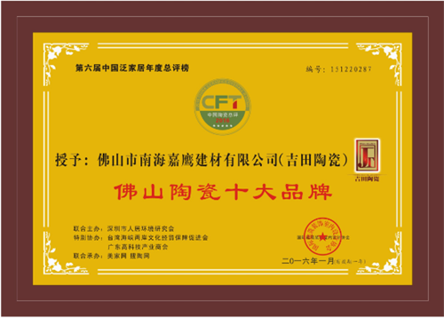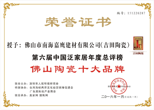 2016年1月7日下午,由國際建筑裝飾室內設計協會主辦的第四屆中國泛家居領袖品牌論壇暨第六屆中國泛家居十大品牌總評榜頒獎大會在綠島湖國際營銷中心盛大舉行。在本次活動當中,吉田陶瓷喜獲“佛山陶瓷十大品牌”榮譽稱號。