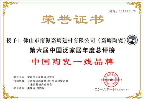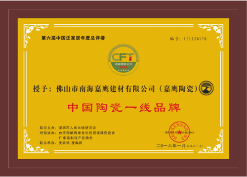 2016年對于嘉鷹陶瓷來說是注定不平凡的一年。在2016年的開端,嘉鷹陶瓷就打響新年第一炮,一舉獲得了“中國陶瓷一線品牌”稱號。