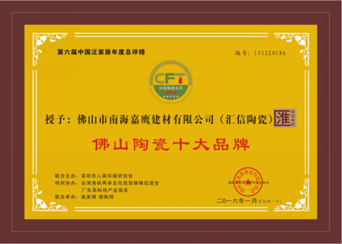 作為一家擁有強勁實力和獨到的生產理念的陶瓷企業,匯信陶瓷一直堅持著“質量第一,顧客至上”的經營信念,本著“互惠互利、共同發展”的原則,在企業的發展道路上不斷開發創新,不斷突破自我。在“第四屆中國泛家居領袖品牌論壇暨第六屆中國泛家居十大品牌總評榜”活動上,匯信陶瓷榮獲“佛山陶瓷十大品牌”稱號,同時也獲得了業內的一致認可。