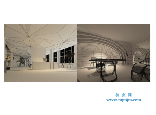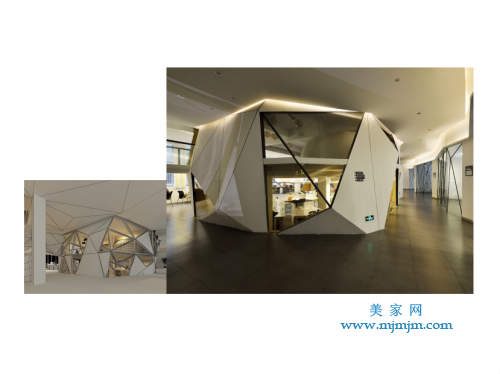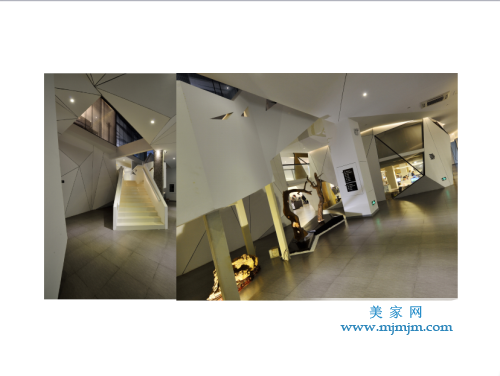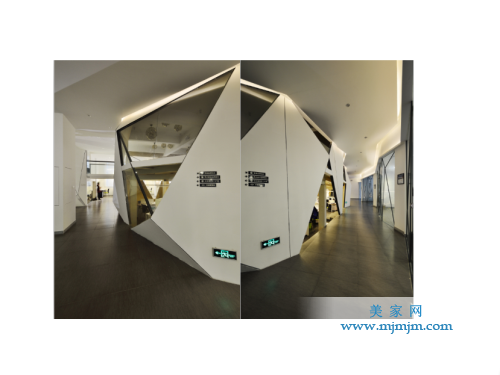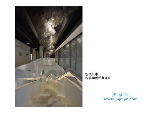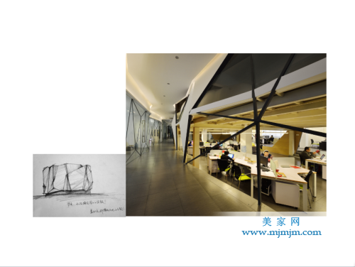 如何呈現(xiàn)?第一采用斜線,在有限的空間里增加趣味感,增加行走動(dòng)線的長(zhǎng)度,空間更為曲徑通幽并富有想象,空間被放大且處處有景。第二是基于東方文化,我認(rèn)為核心是留白。在非常純粹,干凈的空間里面,除了思考動(dòng)線,斜線,斜面之外,還要思考它可以留白的空間。我希望它的呈現(xiàn)像中國(guó)畫(huà)一樣有留白的效果,也體現(xiàn)創(chuàng)意公司創(chuàng)意原點(diǎn),從一張白紙開(kāi)始,既有留白的部分,也有折紙的感覺(jué)。