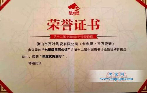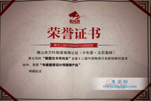 新銳榜表彰在2015年度產品、技術、品牌、商業模式方面,有出色表現的企業及個人。卡布里•玉石瓷磚在數百家企業中脫穎而出,憑強勁的品牌實力獲得組委會一致認可,榮膺“年度最佳品牌”、“年度優秀展廳”、“年度商業案例”、“年度最受設計師喜愛產品”、“年度優秀產品”五大重磅獎項,成為本屆新銳榜獲獎最多企業。