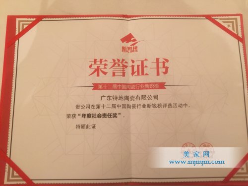 據(jù)了解,素有陶業(yè)“奧斯卡”之稱的新銳榜,歷經(jīng)十年論劍,已然成為檢閱行業(yè)創(chuàng)新成果的權(quán)威盛典,是目前行業(yè)中影響力最大,最公正的評選活動。每一屆都會吸引陶瓷、衛(wèi)浴、機械設(shè)備等上百家企業(yè)踴躍報名,角逐各項大獎。特地陶瓷作為陶業(yè)中的創(chuàng)新典范,連續(xù)多年榜上有名,在2016年的評選活動中,更是憑借著強大的品牌實力與創(chuàng)新力,再次于眾多品牌的角逐中突圍而出,榮獲“年度優(yōu)秀展廳”、“年度社會責任”兩大獎項,本次獎項的獲得不僅是對特地陶瓷品牌創(chuàng)新取得的碩果的肯定,更是對特地陶瓷敢為人先開拓進取的嘉獎。