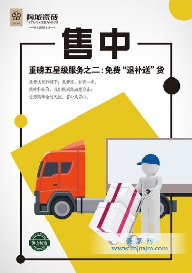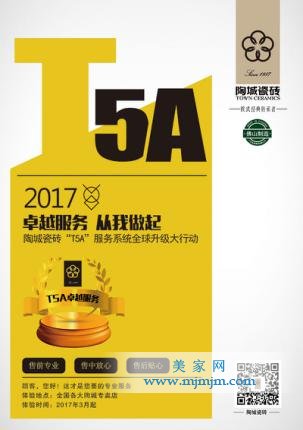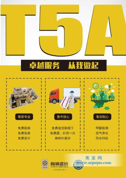 何為“T5A”服務,就是行業超五星級的顧客服務。它是陶城針對消費者打造的系統服務工程,是建陶服務領域的新超越和對消費者服務層次的全新升級。其中包括的內容有:售前,提供免費的量房和用磚計算,免費的定制設計效果圖方案和專業導購家居顧問;售中,專業化的一對一指導施工和效果跟蹤,無憂的“退補送”貨;售后,產品保養,甲醛測試,輻射監測,家居小常識、健康大禮品(除甲醛包、空氣凈化包、凈水包),打造省時、省心、省力的陶城專享愉悅體驗之旅。