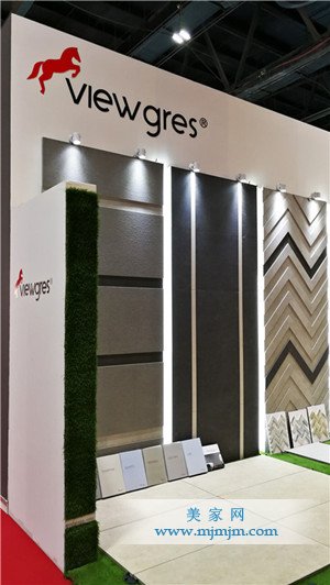 唯格位于展館主入口旁(Hall 6, 6A71),參展產品主打2cm系列,搭配1cm進行結合應用。本次針對唯格幾大核心產品,開發出獨特的3D設計應用方案,用于幕墻展示。地面則以草坪小托盤的搭配完成唯格產品的整個戶外鋪貼展示系統。