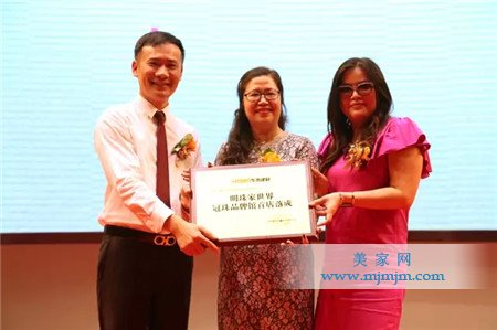 集團副總裁陳先輝(中)授予增城華泰建材總經理何兆雄(左)“明珠家世界冠珠品牌館首家體驗館”牌匾