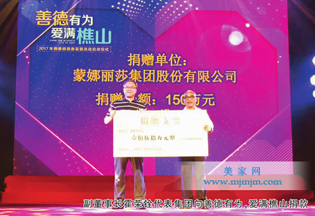 7月13日“善德有為,愛滿樵山”2017年西樵鎮慈善募捐晚會,現場以舞臺演出、支票捐贈、書畫認捐等方式拉開今年西樵鎮慈善募捐的序幕,當晚共籌善款1180萬元,其中,蒙娜麗莎集團股份有限公司愛心捐贈150萬元。
