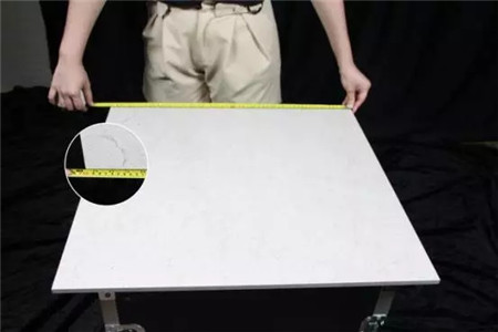 規整度測試主要包括對角線測試、平行線測試。從下面的圖片中,我們可以看到磚體四條邊線均為精準的600mm,對角線長度讀數為848mm,相等的對角線以及邊線根據四方體的原理說明瓷磚呈標準的正方形。各邊線的測量數完全一致,可見威廉頓陶瓷仿古磚生產精度極高。