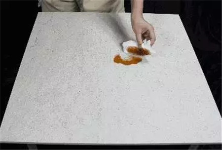 ④瓷磚釉面防透水性極佳,醬油沒有辦法滲入到瓷磚磚體,只需用紙巾抹擦就已潔凈如初。