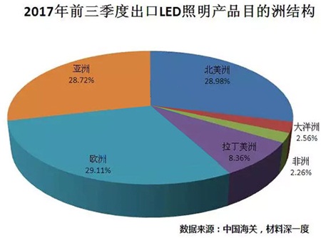北美市場是我國LED照明產品出口的主要目的地區之一。在今年前三季度的出口額統計中,北美市場出口總額超過27億美元,同比增速達到35.01%,占我國LED出口總額的28.98%,超過亞洲市場,位居第二位。