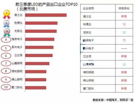 據材料深一度統計,前三季度,我國進入北美市場的LED出口企業達到27870家。按出口額排名,前十名企業如下圖所示(只統計生產型企業數據)。這十家企業的LED出口額約占總額的26.81%。本次排名有一半均為新晉企業,對北美洲出口的企業出口額排名波動較大。