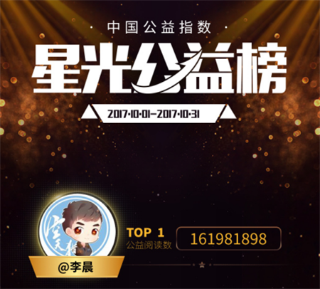 日前,中國公益指數官方微博發布了星光公益榜10月TOP10,李晨以一億六千多萬的公益閱讀數位居榜單第一。細數近年來李晨的公益之路,年度公益偶像、北京環保大使、聯合國環境署親善大使等,都是他熱心公益的最好印證。
