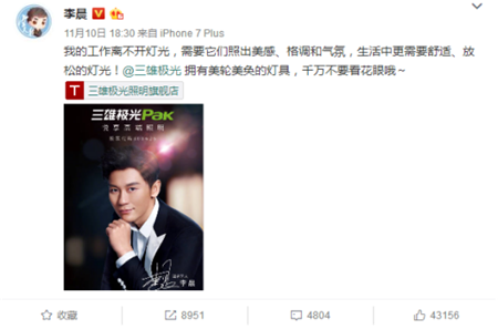 正是這一點,促成李晨與國內知名照明品牌三雄極光的美好姻緣。三雄極光一直堅持綠色節能減排的健康理念,并致力于開發和生產高品質、高檔次的綠色節能照明產品,這與李晨在環保理念上是高度吻合的。