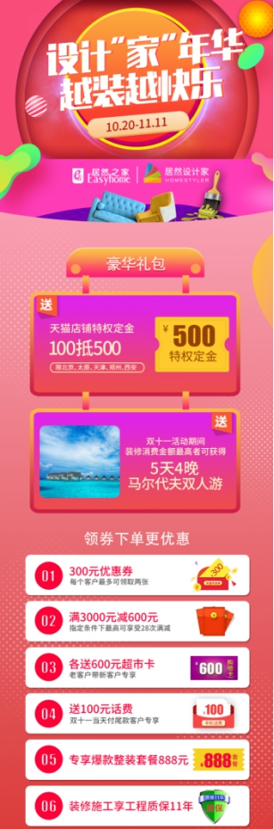 除此之外,在居然設(shè)計家今年雙11的設(shè)計“家”年華活動中,更有每滿3000減600、100元抵500元、掃碼免費領(lǐng)300元優(yōu)惠券、活動期間簽約享受質(zhì)保長達11年以及消費金額最高者獲得5天4晚的“馬爾代夫雙人蜜月游”機會等豪華大禮。