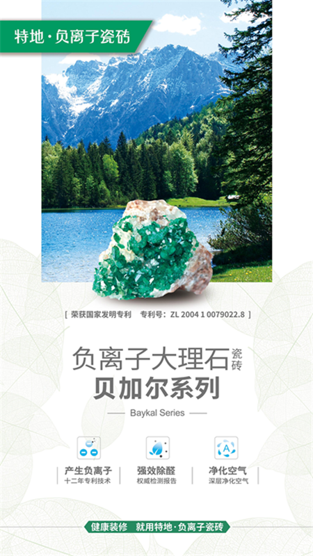 特地·負離子瓷磚是一款可產生負離子、凈化空氣的健康瓷磚,可有效除甲醛、祛異味,是室內裝修污染源的“克星”。每賣一片磚,都是對家庭凈化空氣的一份貢獻!健康裝修,就用特地·負離子瓷磚,十二年專利品牌,值得信賴。
