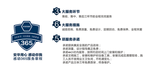 我們通常講到的“315”信用,不但是產品品質要具有保障性,品牌的服務方面也同樣需要用心和誠信。安華衛浴企業一直經營有方,擁有“365”全程無憂服務系統: