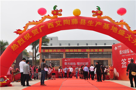活動(dòng)當(dāng)天,廣西艾陶新型材料科技有限公司董事長(zhǎng)劉鴻祥、廣西艾陶新型材料科技有限公司總經(jīng)理劉鴻興、藤縣人民政府副縣長(zhǎng)楊正沛、梧州市工信委副主任陳劍廷、梧州市投資促進(jìn)副局長(zhǎng)李月英、江西陶瓷工藝美院廣東校友會(huì)會(huì)長(zhǎng)/佛山市邁瑞思科技有限公司 董事長(zhǎng)吳桂周等領(lǐng)導(dǎo)嘉賓、企業(yè)代表、媒體代表以及社會(huì)各界人士等近千人出席此次活動(dòng),為艾陶新廠開(kāi)業(yè)增添了靚麗的色彩。