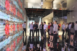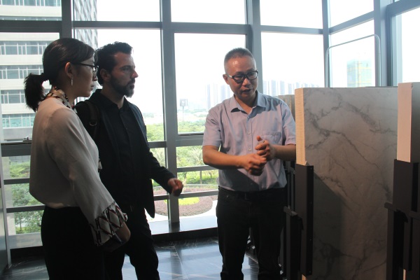活動當天,由霸王集團創始人/小小世界集團主席萬玉華Eva女士、資深融資策劃人/金融總經理陳渭海Wilson先生、項目經理李思慧Krysta女士、COO(首席運營官)/中國區總經理&創新技術專家伊泰Gantz先生、商務拓展(中國區)黃少妍Sireen女士共同組成的以色列技術團隊,以及東鵬技術研發相關負責人鄺志均先生、金意陶技術研發總經理李德英先生、羅曼蒂克技術研發總經理黎炳華先生、芬芳陶瓷董事長/禪城陶協會長胡大為博士、新一派技術研發負責人朱彥秋先生、大鴻制釉技術顧問馮平先生6家本地代表性陶瓷企業技術研發負責人,在禪城陶協秘書長的陪同下首先參觀了金意陶總部一、二、三樓展廳,大家對金意陶順應國家倡導綠色環保理念所創新推出的“綠能”發泡陶瓷、全瓷家居樣板間、發熱瓷磚等企業重點產品給予極高評價。其中金意陶展廳按照不同主題、風格進行配套設計的布局更讓人耳目一新,尤其是多面鏡與LED組合而成的視頻演示廳深受大家好評。