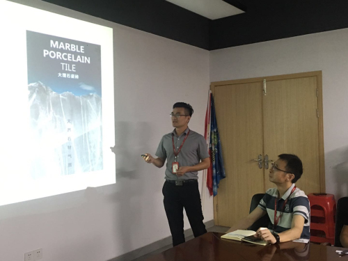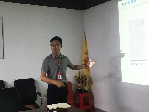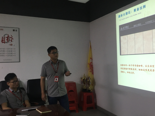 6月8日上午九點,金艾陶瓷磚華夏總部二樓會議室舉辦了一場別開生面的《新品推廣—完成下半年度業績的核武器》-銷售精英演講會,全體銷售精英以及市場部所有人員參與了本次會議。