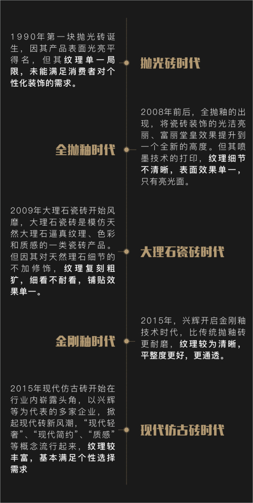 從拋光磚時代——全拋釉時代——大理石瓷磚時代——金剛釉時代——現(xiàn)代仿古磚時代,是技術的不斷疊加進步,不管是從滲花技術——隨機布料——3D噴墨——絲網印花——滾筒印花——下陷釉技術——精雕,都是為了能夠最真實的還原天然石材的紋理細節(jié),讓紋理更豐富真實,色彩更純。然而市面上大多數產品,只是在大紋理或簡單紋理上做大凹槽,往往不是對準紋理,肌理呆板,與原始石材相差大。