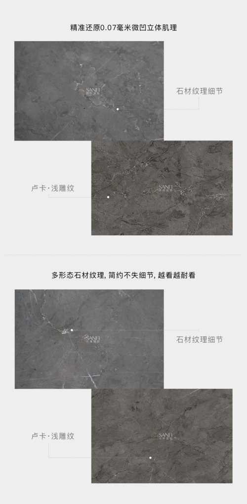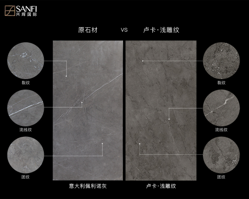 盧卡·淺雕紋系列與意大利佩利諾灰石材相比,盧卡·淺雕紋系列把原石材豐富紋理轉化為現(xiàn)實的細節(jié)美,把流線紋、團紋、裂紋等多形態(tài)紋理精準表現(xiàn),簡約不失細節(jié)。技術的提升使得產品完全體現(xiàn)石材質感,真實還原原石95%以上紋理細節(jié),讓產品整體效果裝飾趨向“完美、真實”,整體細節(jié)處理比原生石材自然還更耐看,更符合高端精致生活需求及美學審美。