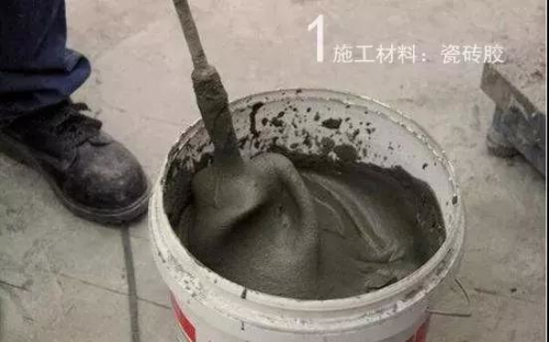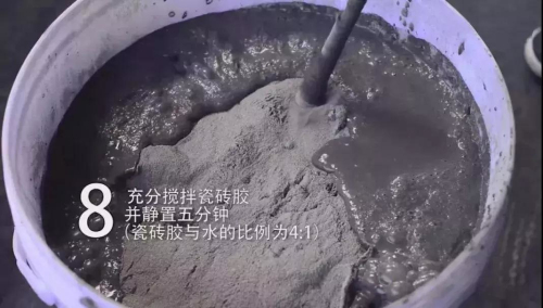 將瓷磚膠與水4:1配置,用灰勺攪拌至潤滑均勻,無明顯塊狀或糊狀結(jié)塊,攪拌后的漿料靜置5-10分鐘后再稍加攪拌1-2分鐘即可使用。