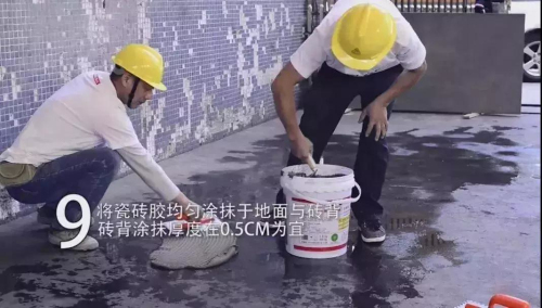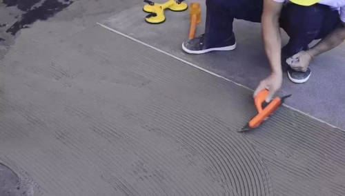 在地面均勻鋪上一層瓷磚膠,形成半干的一層,再次用瓷磚膠填平表面凹凸處,厚度為0.5CM左右;適當(dāng)條件下,可同時將瓷磚膠均勻地抹在瓷磚背面,要求瓷磚膠涂抹飽滿。
