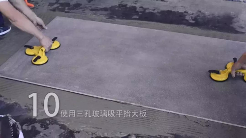 用三孔玻璃吸工具平抬大板平移施工位置,放置到鋪好瓷磚膠的基面上,至少需要2名工人進(jìn)行搬運;面積更大的使用移動架搬運。