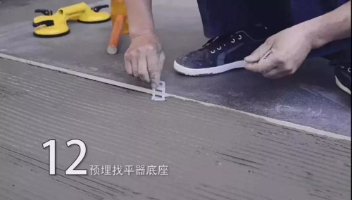 在已定位好的大板邊緣周圍每60cm左右插入找平器底座,檢驗平整后插入找平楔子并夾緊找平器,調(diào)節(jié)相鄰大板的表面平整度,并將大板間隙調(diào)整為2mm左右,以便后續(xù)美縫劑處理。