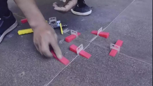 將瓷磚平整地鋪貼在基層上,使用橡膠錘將瓷磚拍實鋪平,便于排出氣泡,輕敲磚面,讓磚底能全面吃漿,以免產(chǎn)生空鼓現(xiàn)象。用木錘把磚面敲平整的同時,以靠尺測量,確保瓷磚鋪貼水平。