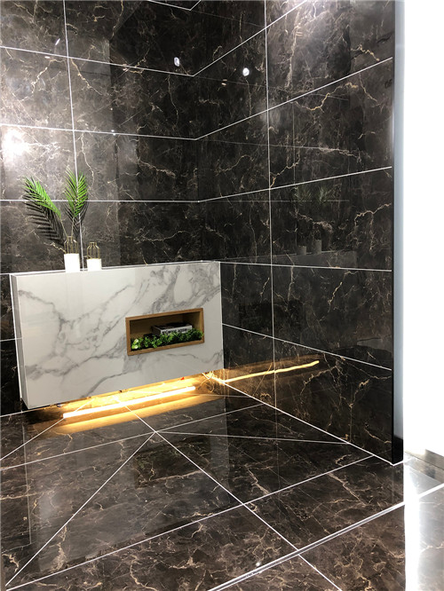 這是由通體大理石KTB9818達(dá)曼深咖鋪貼的衛(wèi)浴空間,800*400切割通鋪,衛(wèi)浴空間講究私密性,設(shè)計(jì)師選用深色磚是考慮到這一點(diǎn),用綠植點(diǎn)綴,讓整個(gè)空間不會(huì)過(guò)于沉悶。不知道你家浴室用這款磚怎么樣呢?