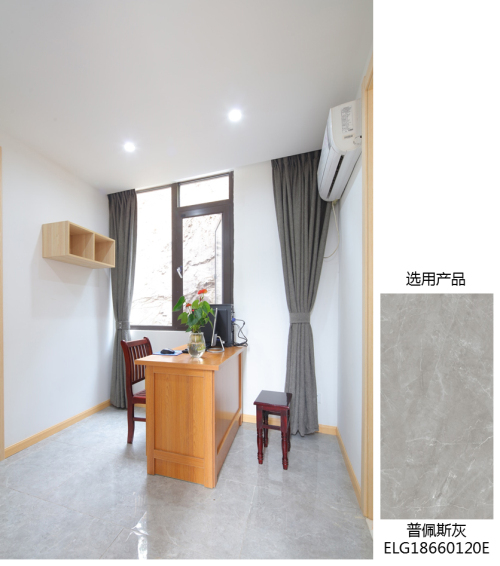 為了給病人提供舒適的空間環境、余家軍一家能夠輕松打掃清潔地面,設計師羅勁特意在歐神諾門店選擇了一款柔光面的大理石瓷磚——普佩斯灰ELG18660120E,應用在診療區、取藥室、檔案室、辦公區、主臥室、觀察室的地面。