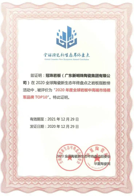 冠珠瓷磚憑借強大的智造能力、技術創新能力以及高質量的產品,贏得了行業內外和專家評審團的一致認可,榮獲“2020年度全球巖板中高端市場領軍品牌TOP10”。這無疑是對冠珠瓷磚品牌實力的認可,也是冠珠未來堅持做好瓷磚,做消費者喜愛瓷磚的動力。