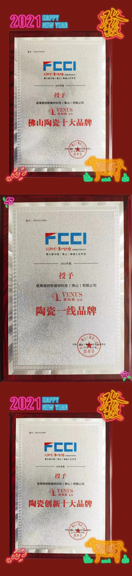 2021第九屆中國(佛山)陶瓷工業年會在佛山禪城智慧新城盛大開幕,維納斯瓷磚憑借國際范的設計與定位,立足中國特色的市場需求,打造適合新時代消費潮流的產品,在眾多品牌之中脫穎而出,榮獲“佛山陶瓷十大品牌”、“陶瓷一線品牌”、“陶瓷創新十大品牌”三項大獎。