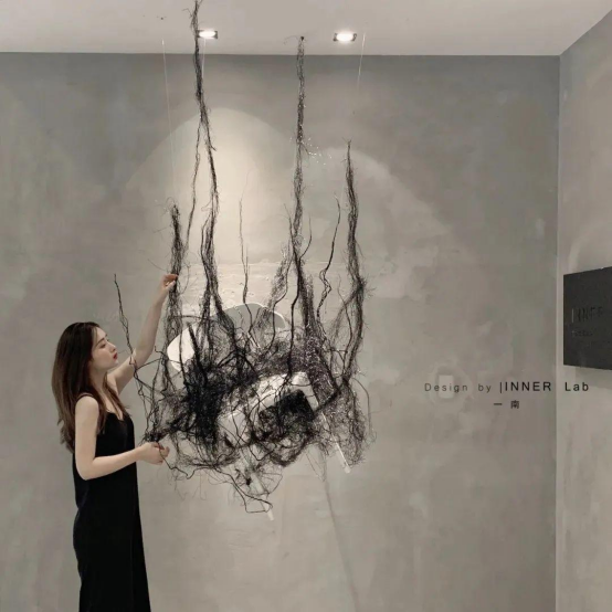 正因受到第三代香云紗巖板的影響,觸發了黃鹿對于此次香云紗非遺文化藝術裝置《無界》的創作靈感。她采用一貫的現代裝置藝術創作手法展現出超群的生活美學,將香云紗原料——蠶絲、薯莨、河泥作為創作素材,配以高山天然生長的枝藤進行融合創作。
